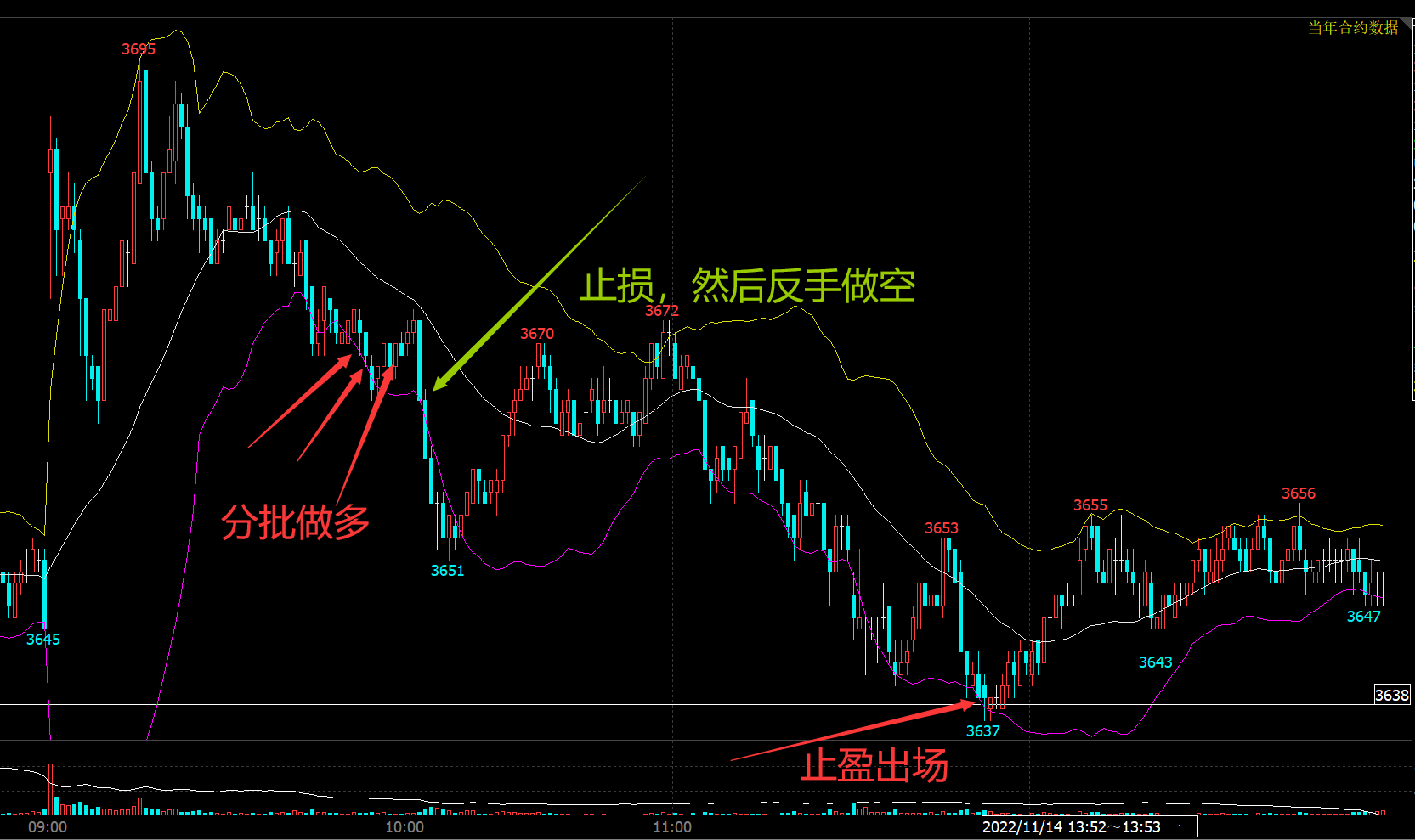 下图是今日螺纹钢期货日内交易逻辑在K线图上标注: