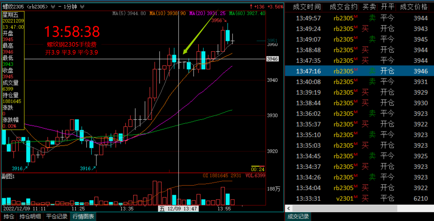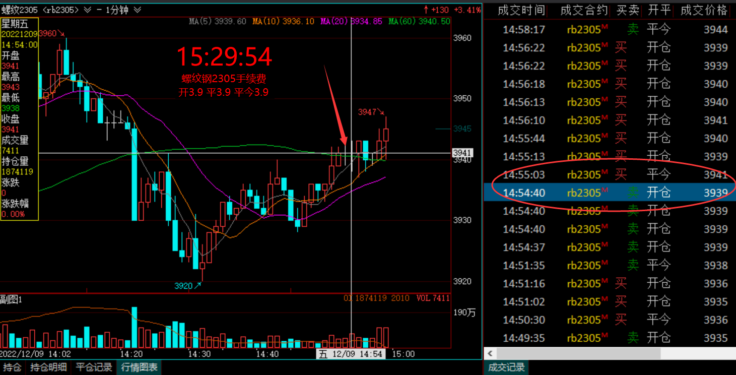 最后分享一点在盘尾一笔单子,当时看到盘口上不去了,然后有人在卖一3940上挂出2000多手的单出来,压了有几分钟,这时候我直接朝着买一空了一把进去,价格向下走了两个点,这个时候有点侥幸认为可以拿个三四条吧,结果瞬间被几个单子拉上来,并且拉上来还直接把3940的两千多手吃掉了,我反应有点慢了,立马对价砍在了3941上面了,等价格回落到3939的时候开多并且连续加仓了好多笔,最后这单赚了差不多五个点,相对于我这种刷单的人来说四五个点算是大点数盈利了。上图: