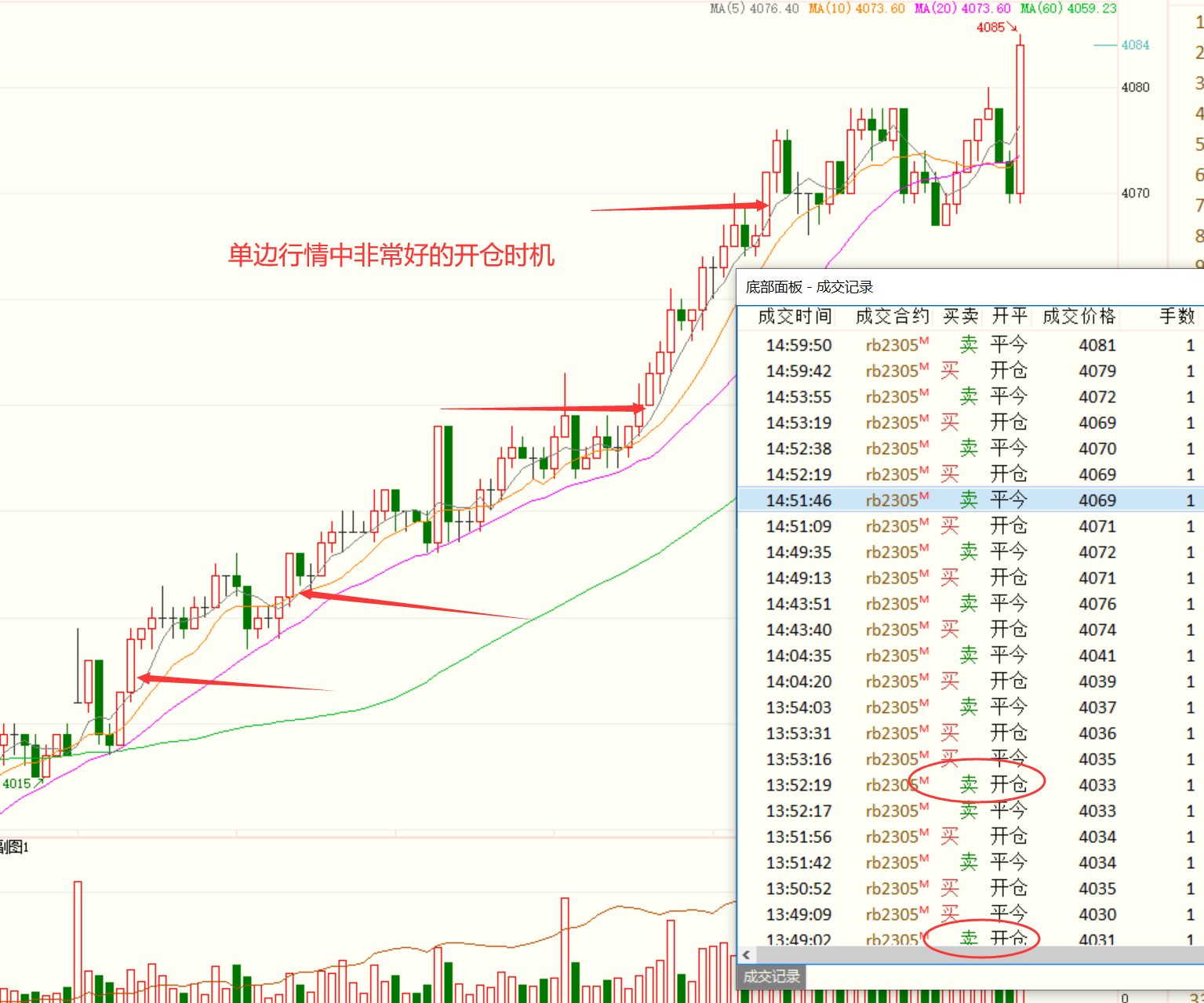 贴一段今天在螺纹钢这种单边行情中炒单的成交明细,盼大佬们指点一二。