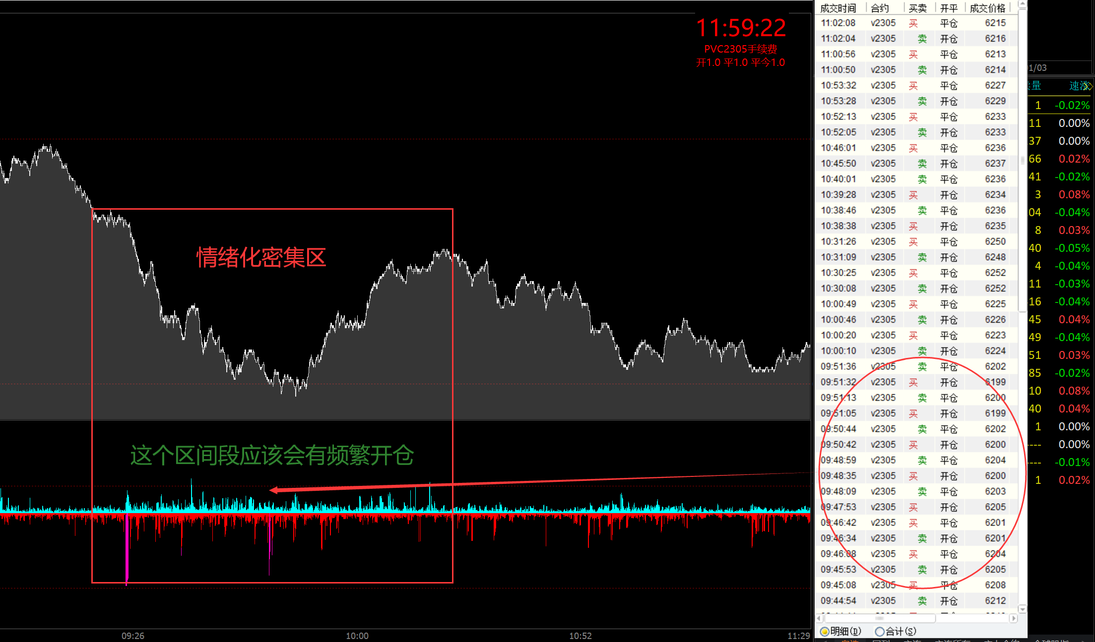 这两天的PVC行情非常火爆,量能非常大,吸引了大批炒单、超短线的资金进场,这个时候往往也是我们程序化最有优势的时机,我们这款情绪化类策略主要针对止损流设计(我们把止盈动作全部归划于止损),一个交易员的平仓动作只有一种,即价格达到了自己的预期:这种预期可能是止盈位、止损位、或者是规避风险、未及目标的退场、超过心理承受极限等,但归结到一点就是价格达到了某种预期。量化交易中假定行情(参与者推动)的一个情绪数值,情绪数值的波动率达到一个阀值(或者说加速度衰减到一定数值),这个时候往往会变盘,变盘的方向取决于推动这种情绪前进的方向。今天早盘市场在9:30至10:30这种情绪密集区,是情绪化类策略最有效的时段,表现结果为胜率高,开仓成交率大,风险相对可控。这种混乱的场面里面的短线交易员们的情绪化单占比非常高,这也是策略设计的根本和盈利的来源。