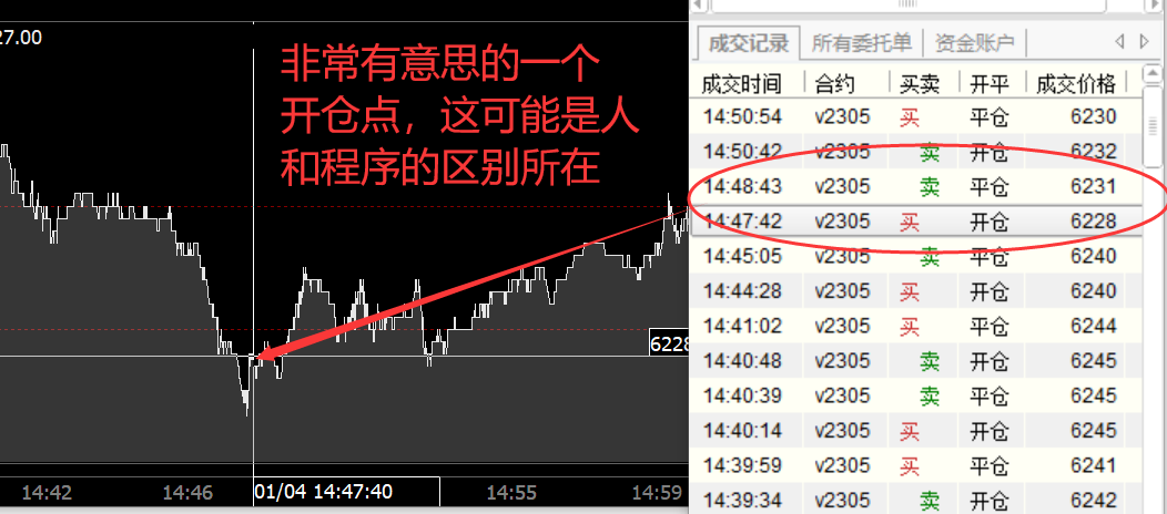 下午收盘后,在监近盘尾,发现一个有很意思的开仓点,在一个急速流畅下跌弹回来几个点的区间后,程序立马介入了,这个开仓点在手工来说很难做到,这种位置的多单,手工抄进去大概率是要止损出来,程序却“扛”了一分钟,奇葩!。