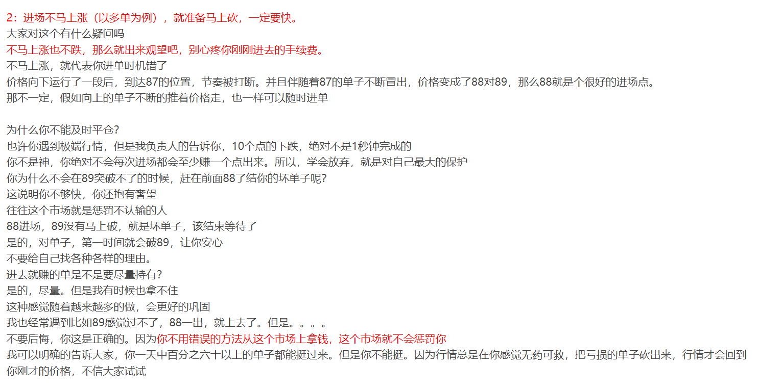 上面贴子发表时间为2010年,是期货大佬”怀念“版主发布于易家论坛,距今已经有12年之久了。然后我们再去对比看看炒单大神奚百成(赚钱养舟舟)的2021年的炒单教学视频、还有553大佬之前的关于炒单的贴子,赚钱养舟舟的核心思想就是在一个区间的上下沿翻价的时候介入(反向翻),553的经典语录就是“突破”-“炒单的核心技术就是翻价(我理解为正翻),还有本人最佩服的新生代短线大神mile同学,他们的初期的炒单手法几乎都离不开翻价。当然每个人对于翻价这个概念理解不同,但其核心还是一致的。炒单的本质和唯一的技术核心:翻价!十年前是这样,今天也同样如此一直没变!