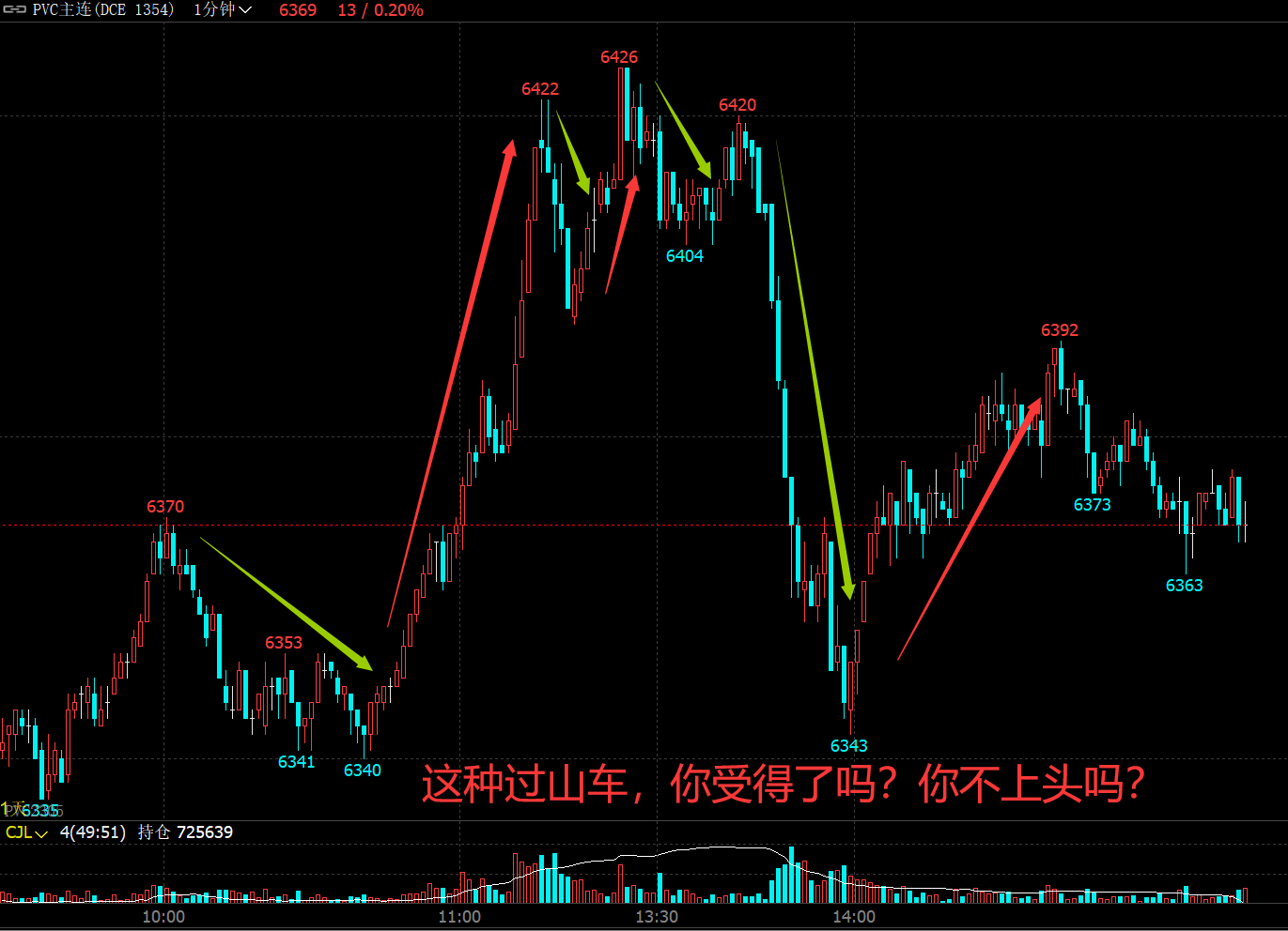 今天的PVC行情真的非常有个性啊,先是两次三十点的震荡,然后突然一波大拉升,直接突破近十日的高点,然后在顶上再来几次30点的震荡,下午开盘没多久,直接一个70点的下杀不喘气直接杀到低,你砍不砍?止损不?不止损他继续往下杀三十个点,等你反应过来砍完了,他又往上拉了50个点!