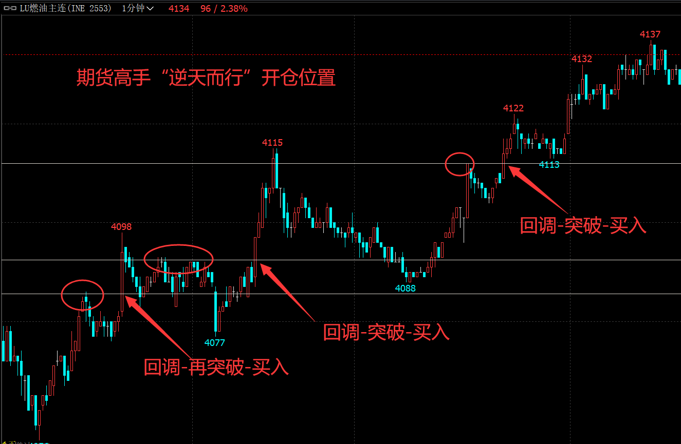 根据“逆天而行”自己所说他主要做非主力合约,按照他的说法非主力合约的行情稍微比较慢一些比较适合他的手法,并且非主力合约波动比较慢比较好判断。主要看1分钟K线,开仓点是上涨回调-然后再向上突破的时候买入,下面以逆天而行最喜欢做的LU低硫燃油的1分钟K线来说明“逆天而行”的开仓位置: