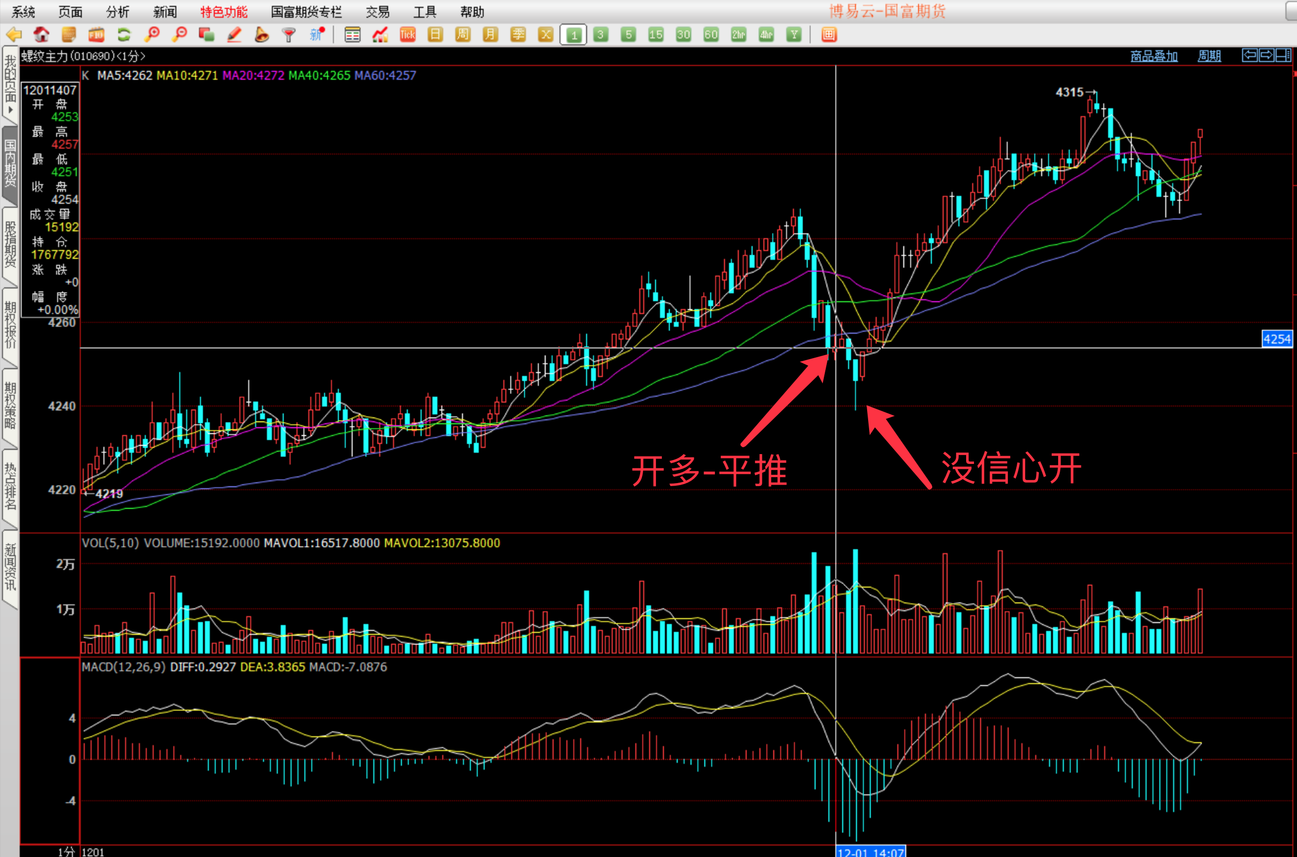 但今天的螺纹也有一个大坑,在下午14点过后的这一波回调过程中,回调的幅度还是相当大的,盘中接了两次回调都没有拿到好的盈利点,每次只拿了两个点就出来了(螺纹现在手续费太贵了2跳算平推),主要是盘中开进去后发现行情向上的力度非常弱,没办法不敢等只能两跳就平出来了,事实证明平推的动作是正确的,努力跑在其它人前面,跑慢了的话自己就是哪个亏货。但是回调到4239点位的时候,不敢接了,一直想等他有一个像样的小平台,结果这种价格居然一个劲的往上翻不敢跟了。今天的单子做得不够好,有三四单的止损太慢了,盘中中对行情有期待,一有幻想就会误事。