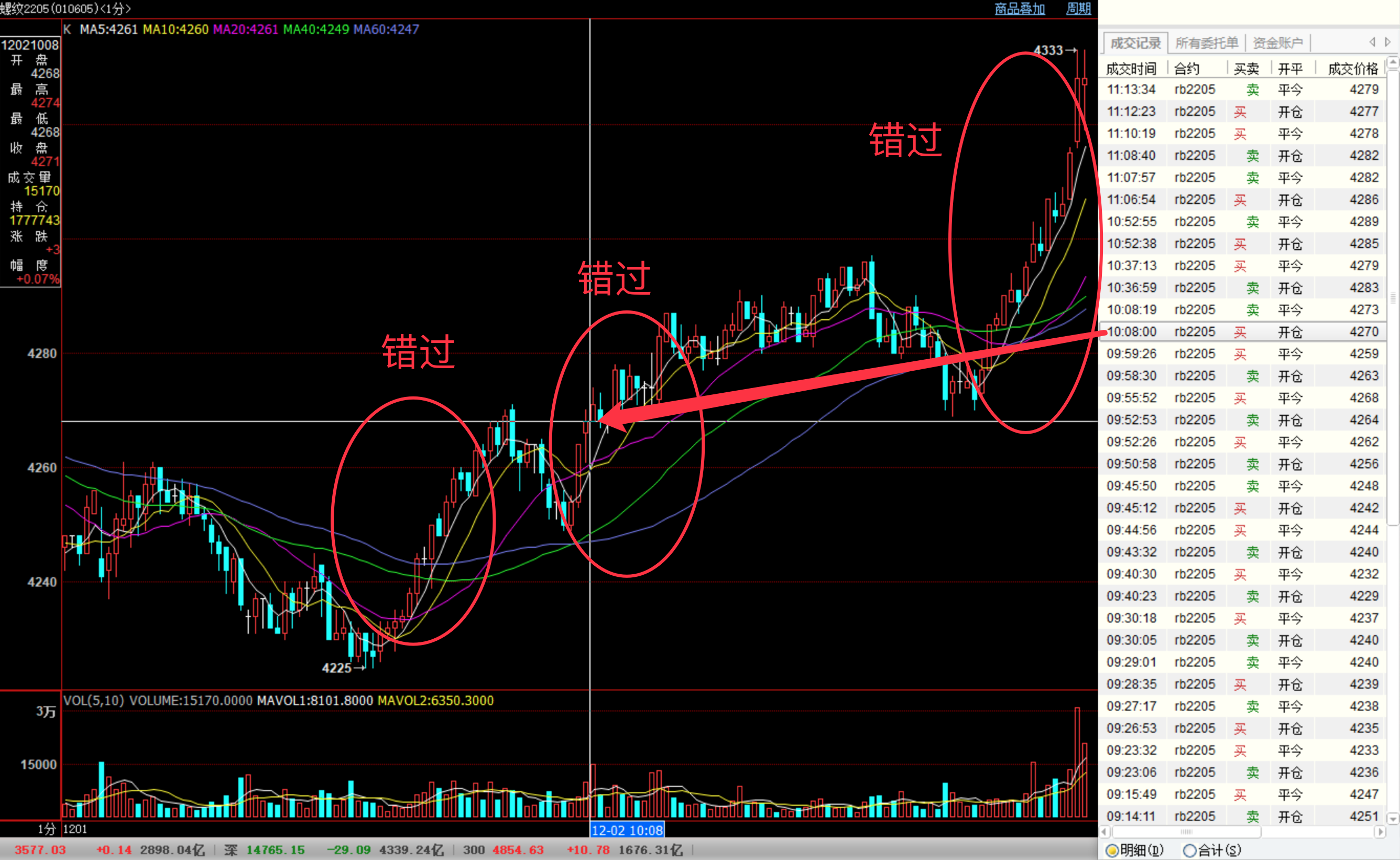 第三个红圈的位置是确确实实错过了,多头气势非常强,翻价也非常有力度,但一直想等一个合适的回档再进,但这样的氛围根本不给机会一路往上拉,找不到舒服的进场点,就只能看着他错过了。