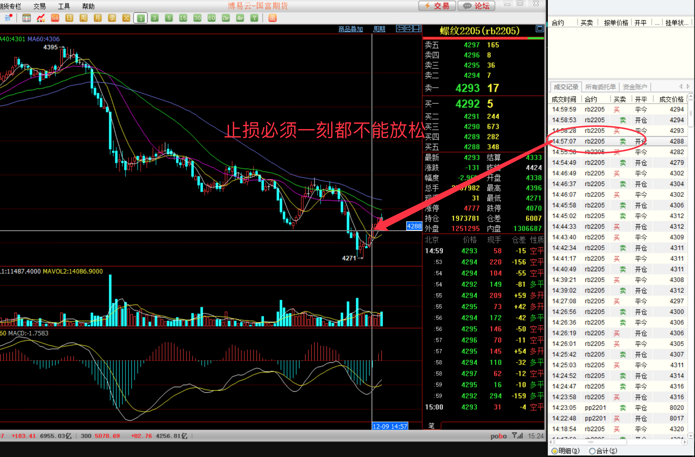 对于期货日内短线来说,止损一刻都不能放松,每次开仓后的止损都不能懈怠,每一次开仓都不能随意,必须严格执行自己的止盈止损规则,否则稍有不慎就会造成大的亏损,今天的螺纹在最后收盘的几分钟还止损了两个大点,14:57分的这个6跳亏损确实不应该,当时有点随意了,认为今天这个空头氛围这么好,盘尾也不会拉多高,然后在毫无开仓逻辑的时候随意开了一个空单,并且没有严格设定止损,太随意了,结果这一个单子就砍出去6个点,确实很不应该。