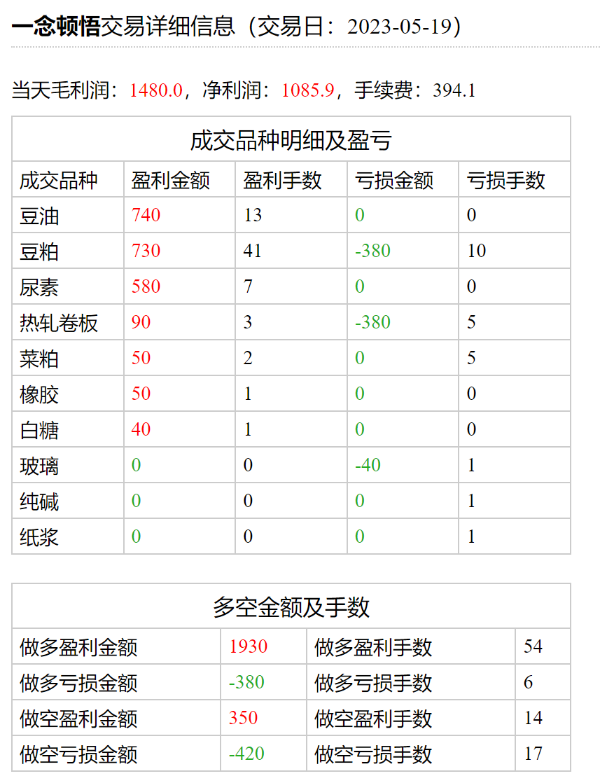 下面是5月19号一念顿悟的交易品种盈亏表:
