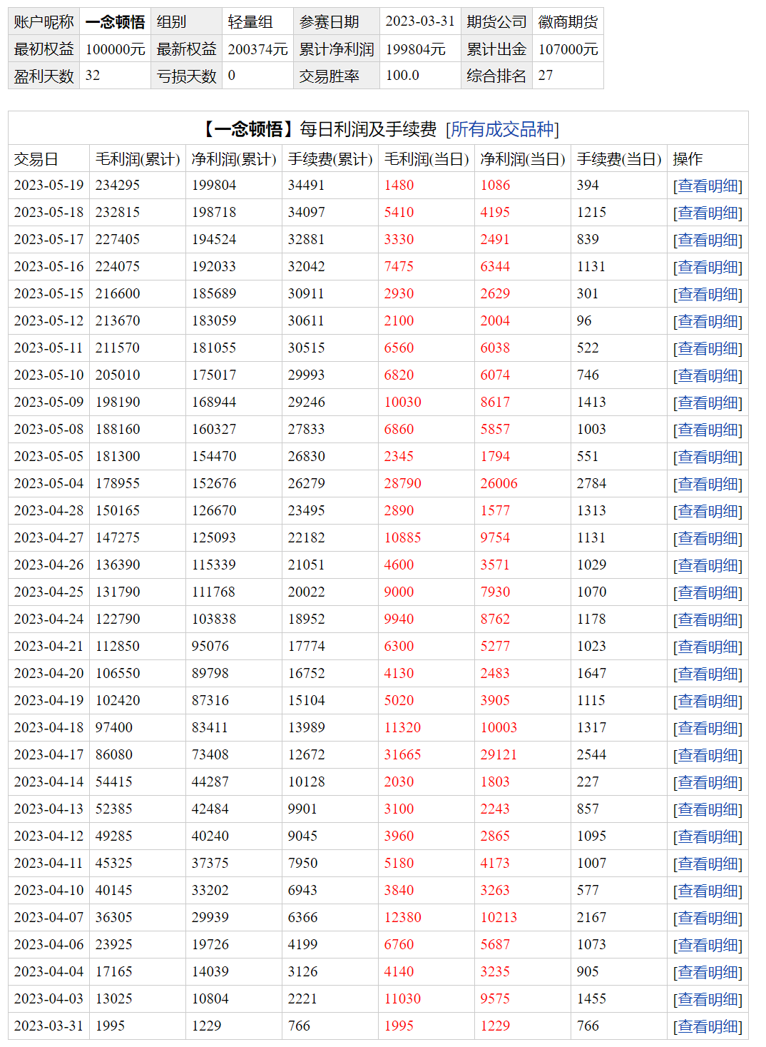 这是本人统计的一念顿悟自3.31号参赛以来的每天的盈利情况,从上表中我们可以看出一念顿悟每天都是盈利状态,平均日盈利率为5%,5%的日盈利看起来不大,但是如果每天稳定在5%正收益上这是相当可观的:初始资金为10万,目前已经盈利20万,已经翻了两倍,虽然在轻量组的排行榜上目前排名第27名,主要是因为前面一些选手空纯碱获利非常大,像“大道至碱”这系列账号几乎占据前20名的一大半。但前面这些选手的稳定性远不如一念顿悟,一念顿悟的日盈利一直保持全胜率状态,没有一天亏损!如果按照这个趋势发展至今年9月31号比赛结束一念顿悟极有可能仍旧是本届轻量组的冠军。