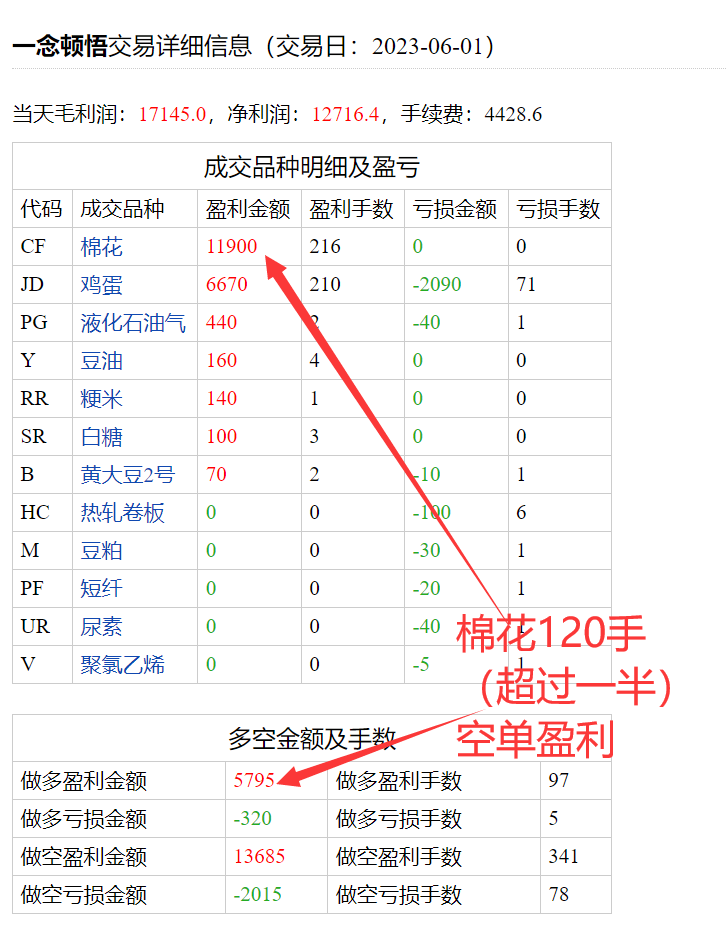 从上表可以看出一念顿悟在6.1日主要盈利来源是棉花和鸡蛋,期货棉花的盈利金额达到11900,盈利手数为216手,无一亏损,棉花的交易胜率为100%!从下面的多空金额及手数列表中当天整个的做多盈利金额为5795,即一念顿悟在棉花上的盈利有一半来自空单!这非常让人费解,因为棉花在6月1日是非常强势的多头行情!