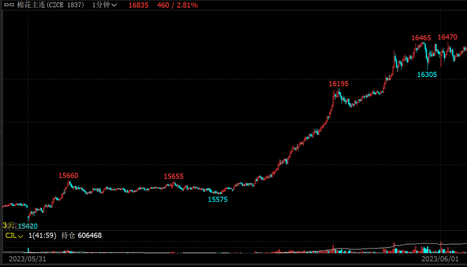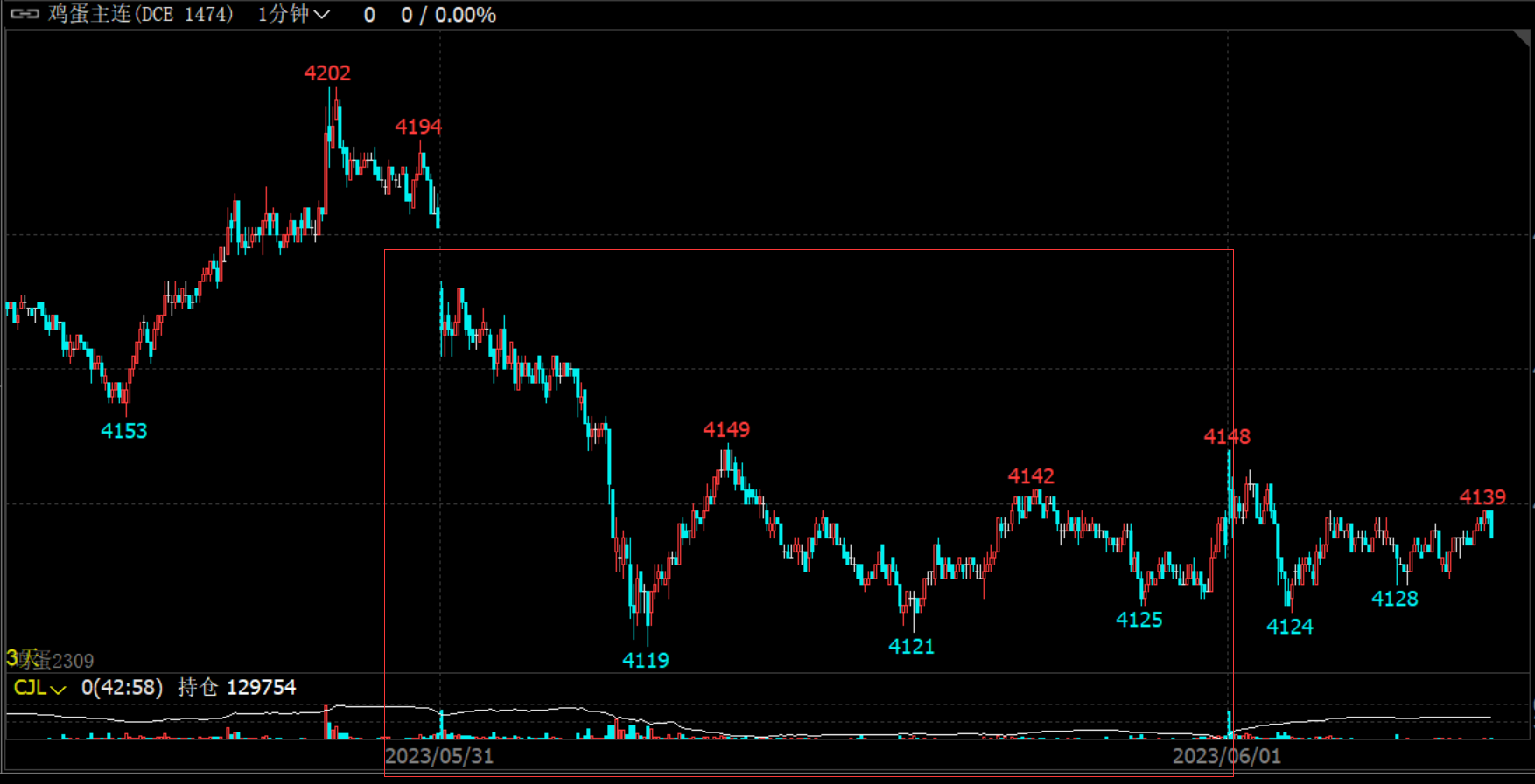 从上表中我们也能很明显的看出来鸡蛋的盈利几乎全部是空单!下面是鸡蛋在6月1日的1分钟K线图: