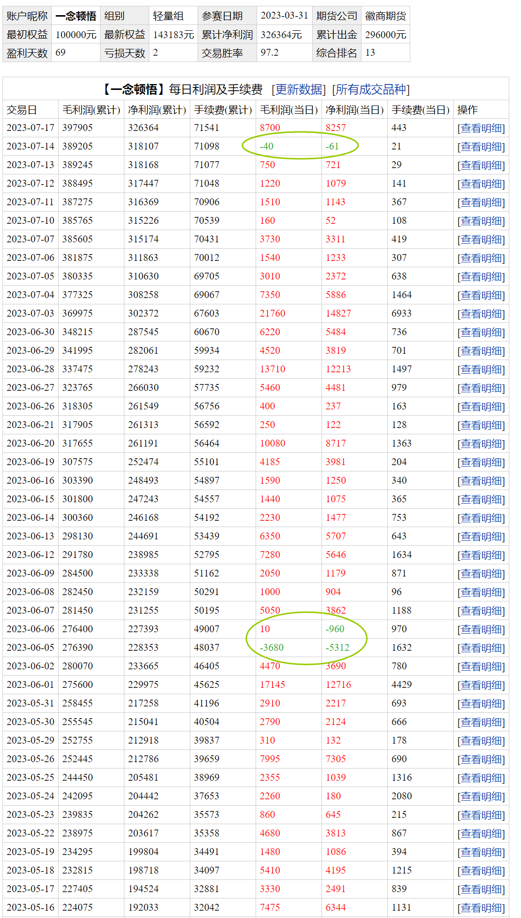 本届期货大赛中一念顿悟(上届期货大赛冠军“逆天而行”)的排名虽然不是很靠前,目前只排在轻量组第13名,但是一念顿悟的特点就是非常稳定,比赛进行到现在只亏损了三天,而且亏损金额非常小,如下图: