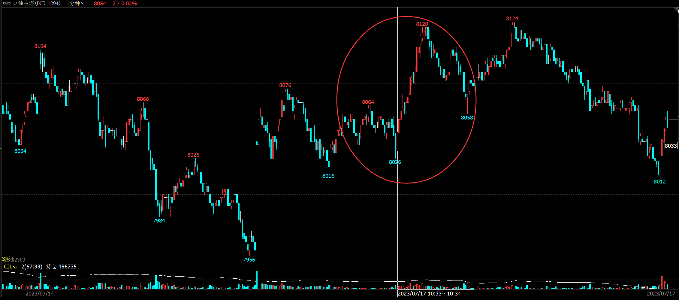 我们可以看到高手一念顿悟今天的主要盈利来源是做多豆油,豆油的多单盈利7300元,盈利手数为13手,豆油每跳价差为20元,相当于他这13手豆油多单平均每手盈利30跳!这完全是波段手法的盈利!(炒单都是快进快出小盈利小亏损),我们再看一下今天豆油的1分钟K线图: