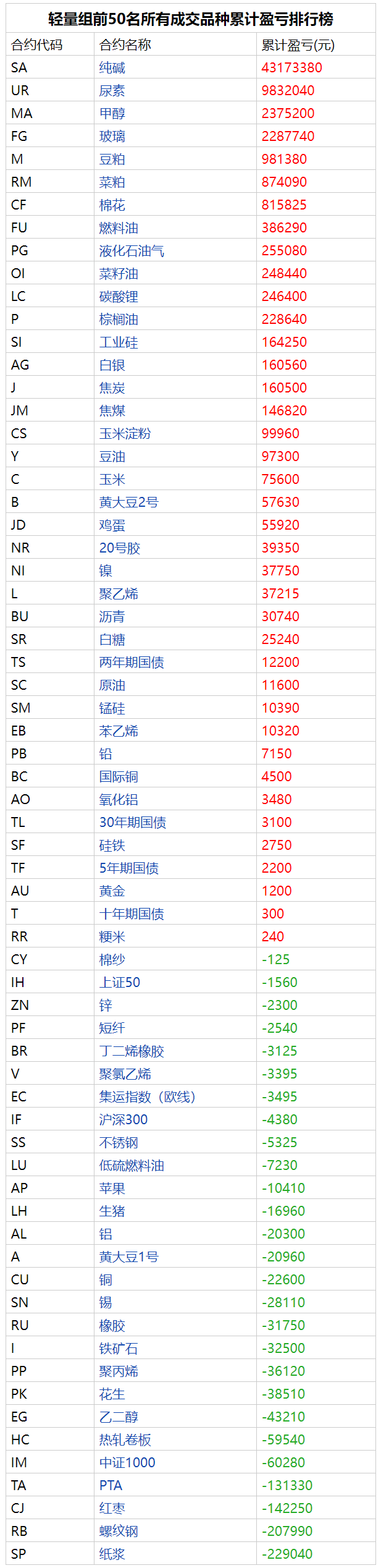 轻量组前50名所有成交品种累计盈亏排行榜(完整榜)