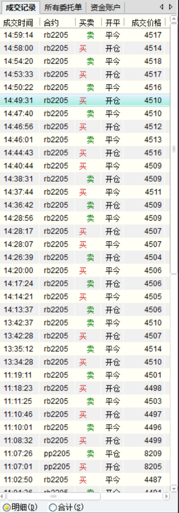 今天的螺纹做得还算可以,但有几个比较大的止损:原因就是在追高的时候(突破)反应不够及时,一直想等一下看看价格能不能上去,结果跑在别人后面跑太慢了砍大点了。还有一种情况就是想挂单平仓,结果价格翻得太快了根本挂不出来,最后直接对价砍。