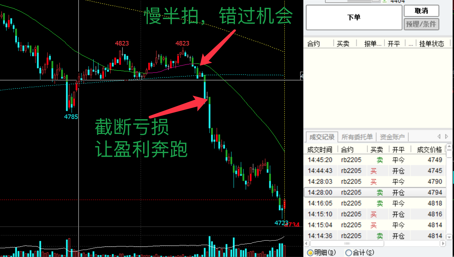一个好的正向的期货交易系统,必定是正向的盈亏比,正向交易系统就是截断亏损,让盈利奔跑,体现最大化盈亏比,投机大佬Livemore说过:截断亏损,让盈利奔跑(盈利会自己照顾自己),在盘中很少人能够这样做到,大部分人是截断了亏损的同时也截断了盈利。今天在螺纹上体现就非常彻底,在14:22分的时候想贪心多两个点的止损位想再等一两根K线再进,结果错过了最佳开仓时机。在14:28分的时候成功介入了空单,但没有做到让盈利奔跑的理念,浪费了大好行情。