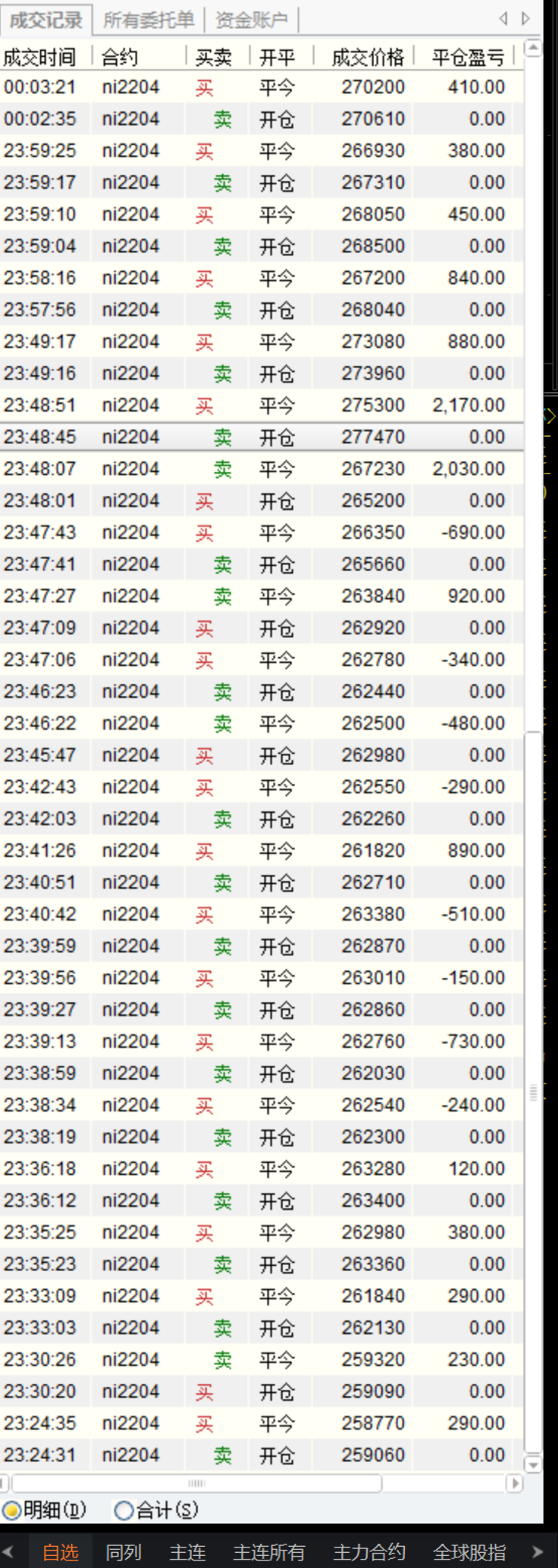 昨晚打开电脑的时候已经晚上11点多了,很多品种都已经收盘了,只是沪镍和沪银几个品种还在交易当中,看到沪镍开板后成交非常活跃,而且盘面的规律也非常好,然后炒了几把。今天白天只做了几单螺纹,螺纹在换月,并且近来螺纹成交非常清淡,单子开进去了盘面就不动了,非常不好做,很容易亏钱,螺纹的手续费都没有打平。螺纹主力合约是rb2205,目前的手续费日内开平加起来是万分之四,一开一平手续费20元,非常贵,而且螺纹的波动太小了,沪镍的手续费看起来很贵,但是沪镍的波动非常大,一但做对方向,立马就给你很大的盈利,当然一但做错了要以极快的速度止损。建议炒单的话不要做螺纹主力,手续费太贵了不划算,可以从手续费列表中找一些手续相对比较便宜的而且波动不错的品种操作。