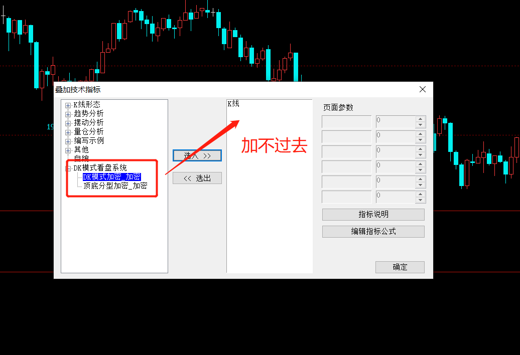 然后在左边的指标列表中选择安装好的加密指标,点击“选入”按钮,按右下角的“确定”按钮:
