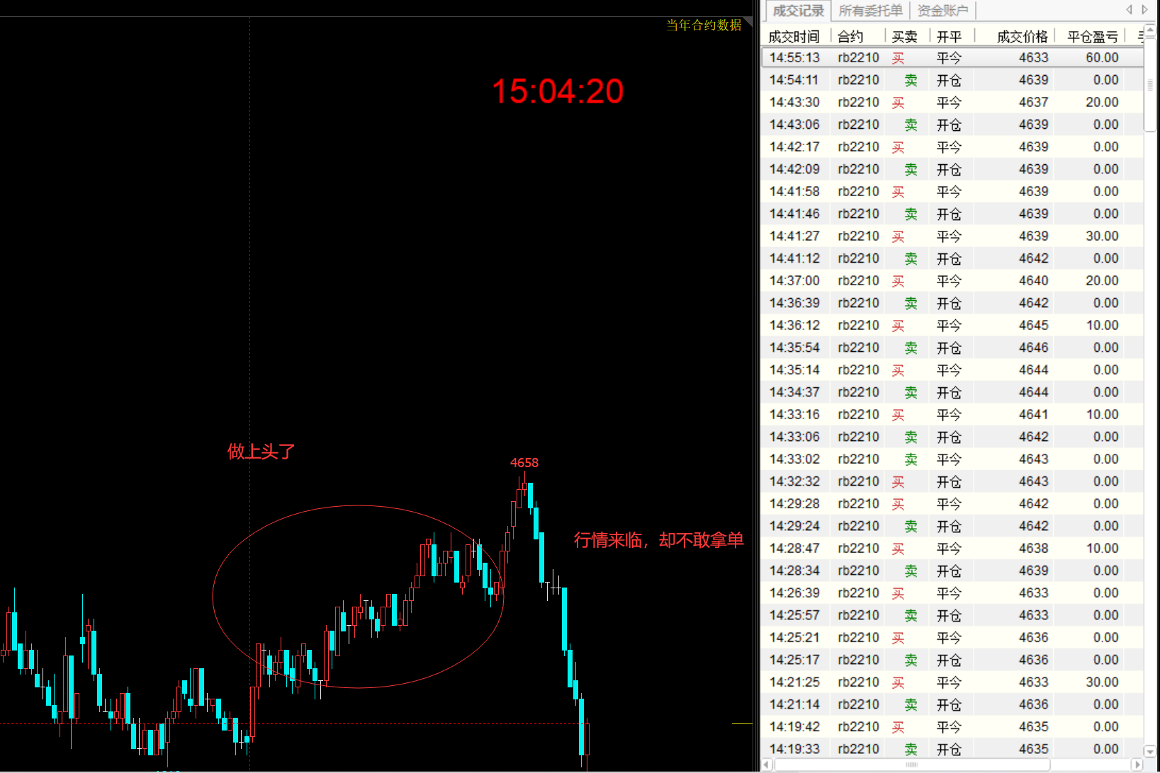 在盘中如果产生的了连续亏损,或者连续的很多单都没有赚钱,这个时候一定要冷静下来,去WC晃悠一圈,或者起来去倒水喝,或者把手离开键盘以一个旁观者的身份冷静的看一下盘面。无数的历史的经验告诉自己,任何一次大亏都是由于上头了,情绪失控了,想把前面的损失扳回来,急着想把亏损捞回来,一但有这种心态的时候,就很容易被盘面蒙蔽双眼,会缺乏思考,看到盘面上都是机会,然后频繁的开仓,然后频繁的止损或者不愿意止盈,也不愿意止损(扛单)导致越亏越大产生不可挽回的局面。无数的经历表明:其实只要耐心做,一切亏损都可以打回来,都是可以盈利的。做单的时间久了,总会有一些个人的经验,总会有一些自己把握非常大的行情,做好这些行情就足够了,不要想着啥行情都想抓住:想抓住任何行情往往其结果就是啥都没抓住、产生了一大把的手续费甚至造成亏损。
