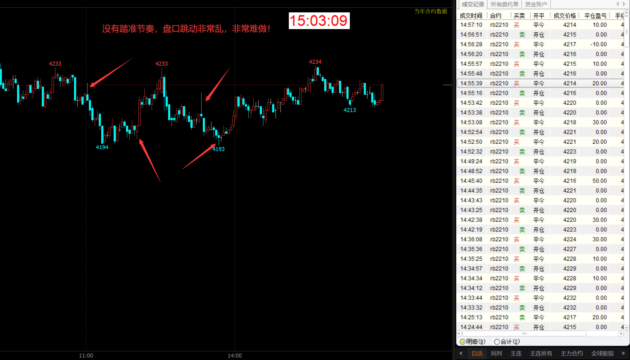 昨天和今天的螺纹非常难做,整个盘面上下无序晃得太利害,非常容易多空止损,按照平常的开仓逻辑,单子开进去,很可能就被几笔大单子给砸回反向,并且价格没有什么延续性,当价格拉到某个位置,只要停顿了一下不动,立马就会有平仓单砸出来,防不胜防,回想起曾经的高手说的这种盘面就是非常垃圾不要参与,似乎有炒单高手在里面上下盖帽,所以今天做单要非常小心,当盘面不活跃不兴奋的时候(没量)的时候,一定要降低预期,出场要非常果断,一但你稍微带一点犹豫就会被人抓住。