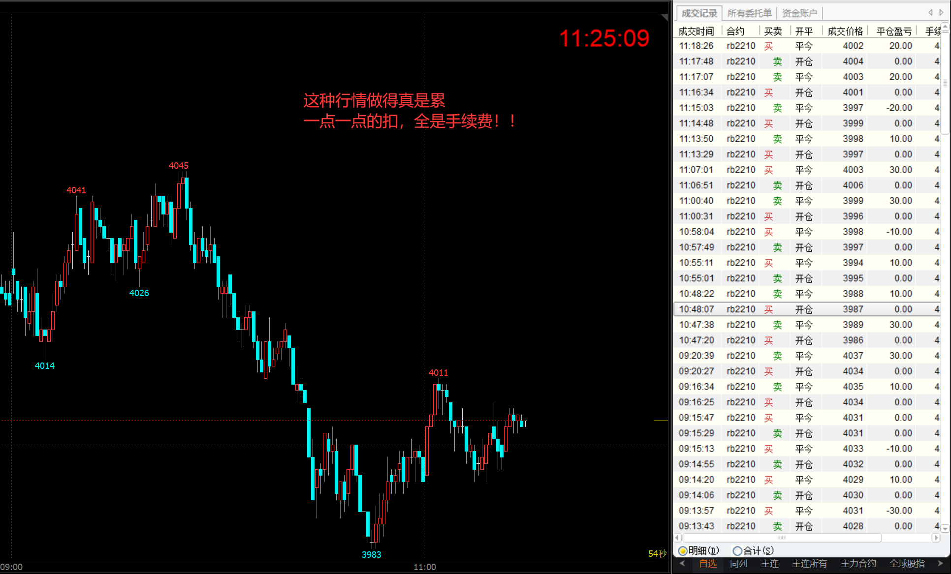 今天的螺纹真的是非常难做,根本看不清方向,价格上上下下来回翻腾,这种行情一定要控制好自己心态和情绪,要用十足的谨慎心态来对待,否则很容易造成大亏,特别是如果连续发生了几笔亏损以后,一定要静心下来,放慢节奏仔细观察行情,努力调整好自己的下单节奏(符合行情特征),绝对不要赌气与市场做对(或者期待市场会给你奇迹),否则极容易造成连续止损进而造成巨额亏损。止损后一定要摆正心态,切不可急于扳回否则一定会越亏越多。