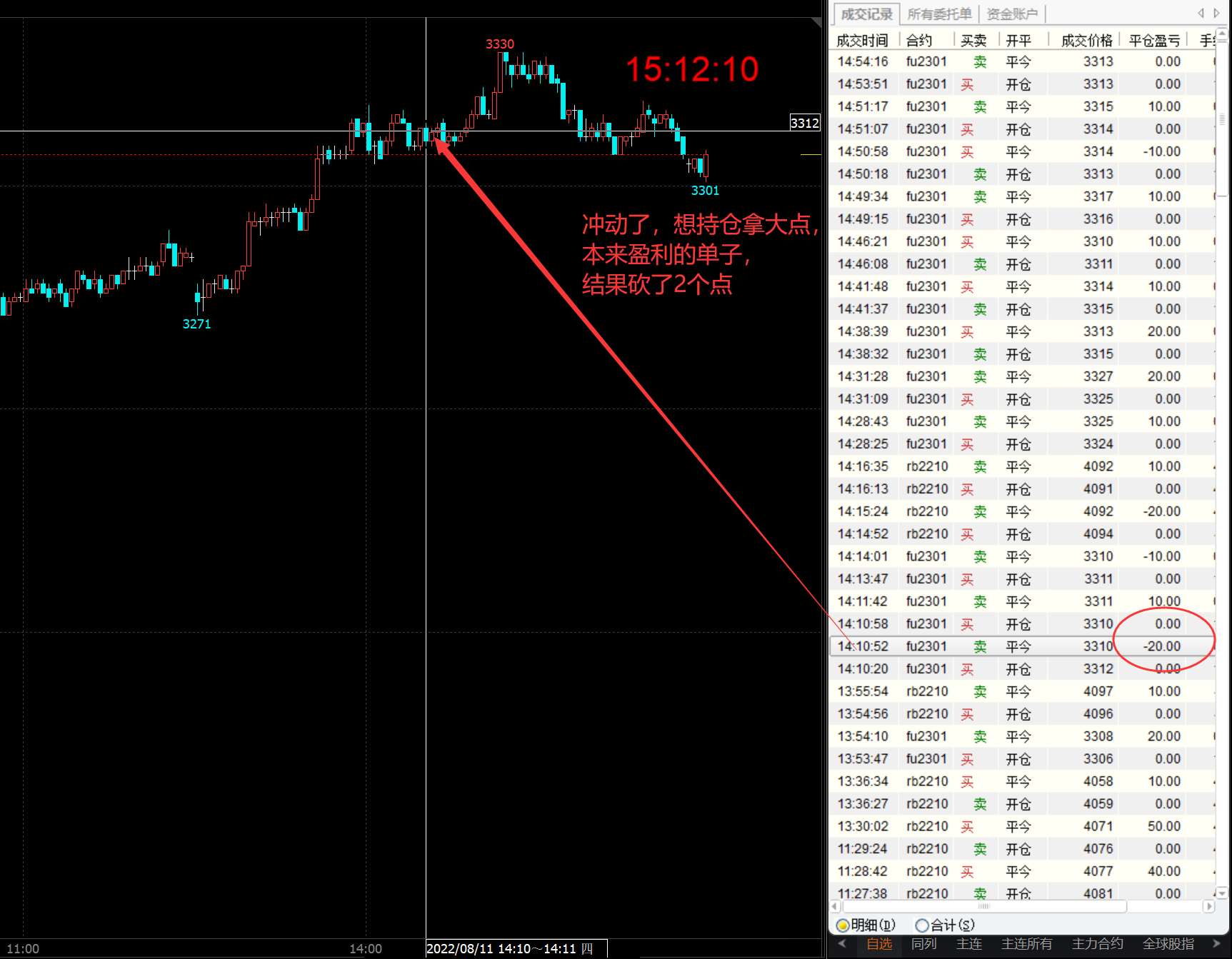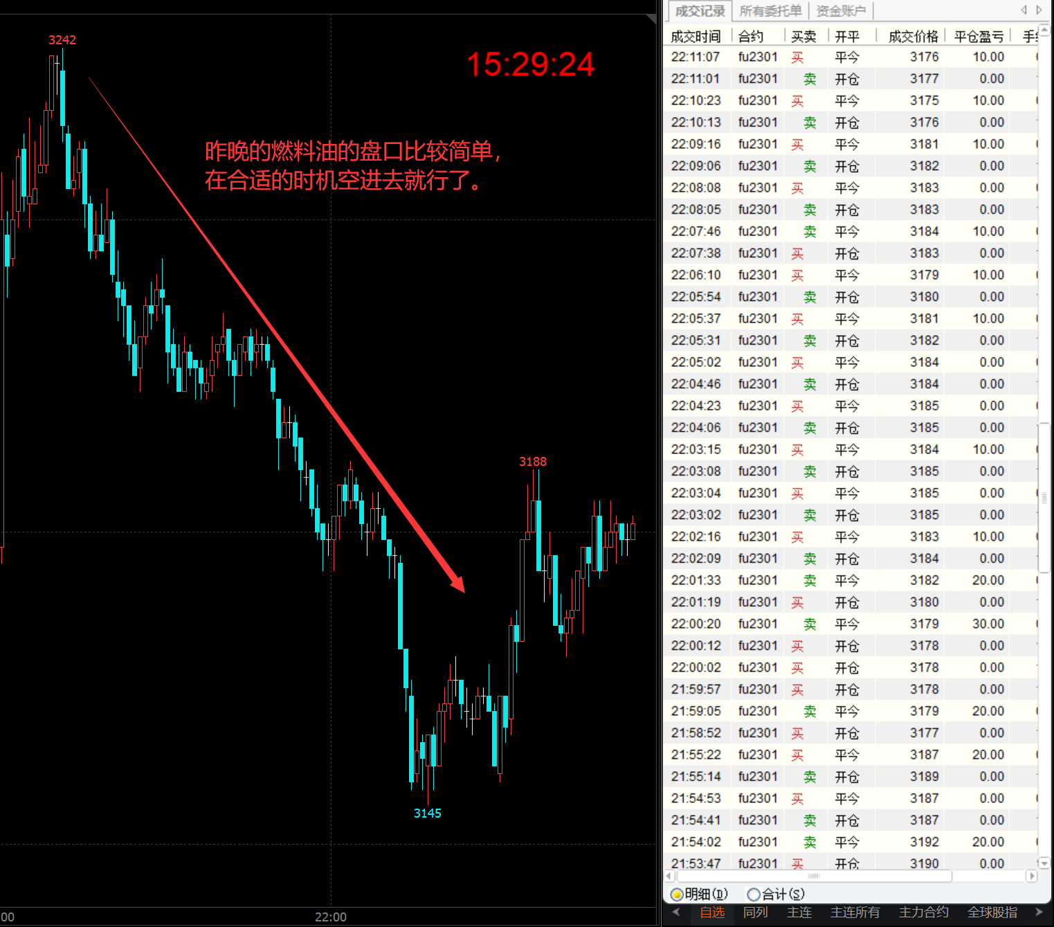 下面是昨天晚上的炒燃料油FU的交易明细,昨晚FU2301的盘面非常简单,在合适的点位直接空进去就完事了,一般几秒钟就给盈利,有盈利立马走不墨迹。因为手续费便宜,接下来再进就可以了。